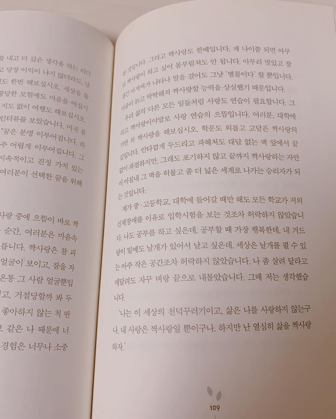 “...하지만 삶은 조각 퍼즐 맞추기 같은 것입니다. 지금 들고 있는 마음의 조각이 여러분 삶 전체의 그림 중 어디에 속하는지는 긴 세월이 지난 다음에야 알 수 있습니다. 지금 조금 아파도, 남보다 뒤떨어지는 것 같아도 바로 그 경험이 훗날 여러분의 삶을 풍부하고 의미있게 만드는 힘이 될 수 있습니다.” -p. 105-