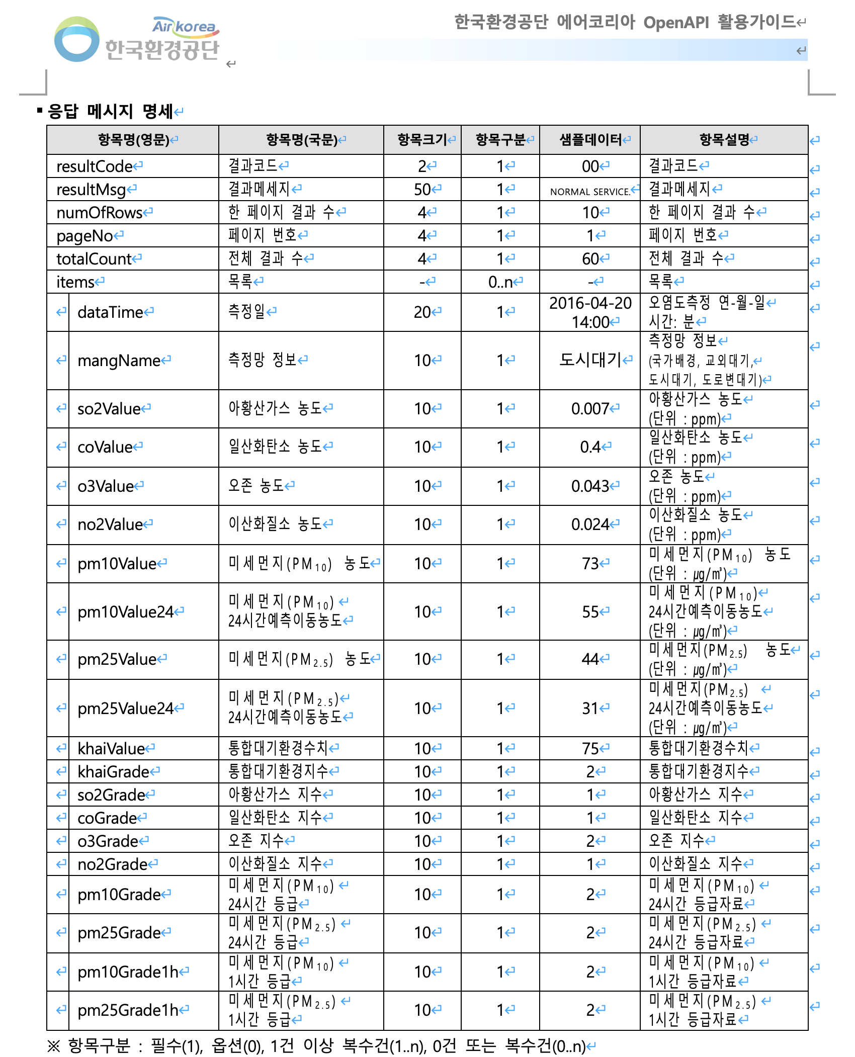 한국환경공단에서 제공하는 OpenAPI 활용가이드에 따라 응답 값 중 dataTime(측정일시), pm10value, pm10Grade, o3Value, o3Grade... 등을 사용한다.