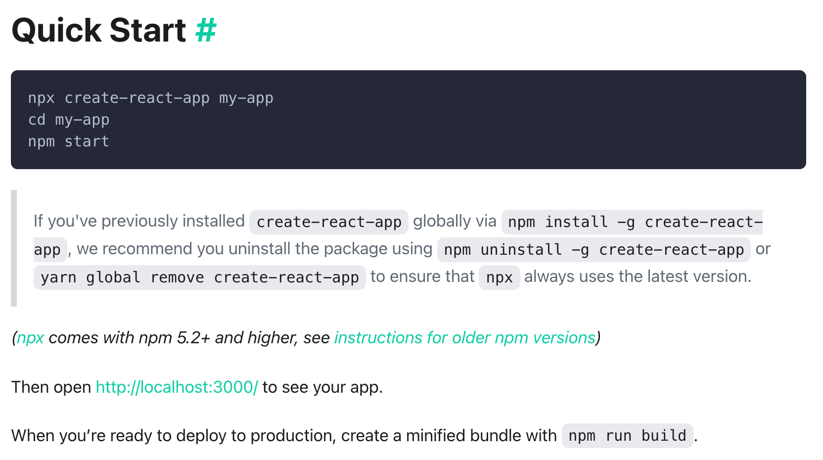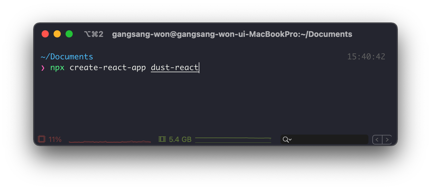 위와 같이 dust-react라는 React Application를 생성한다. 참고로 create-react-app은 node 5.2.0 버전 이상부터 제공되는, 일회성 설치 옵션 npx를 사용하길 권장한다. 따라서 시작하기 전에 npm을 최신버전으로 설치하고, 위 스크립트를 실행한다.