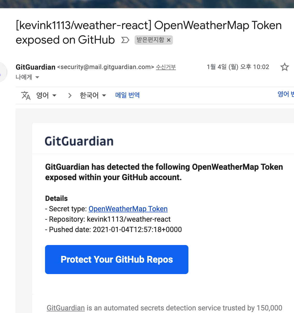 실제로 필자도 아무 생각 없이 GitHub Public Repositiry에 API Key가 포함된 코드를 올렸다가 바로 이런 이메일을 받았다.